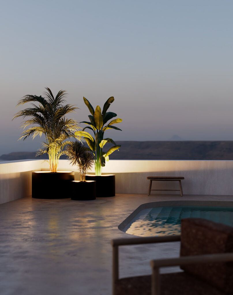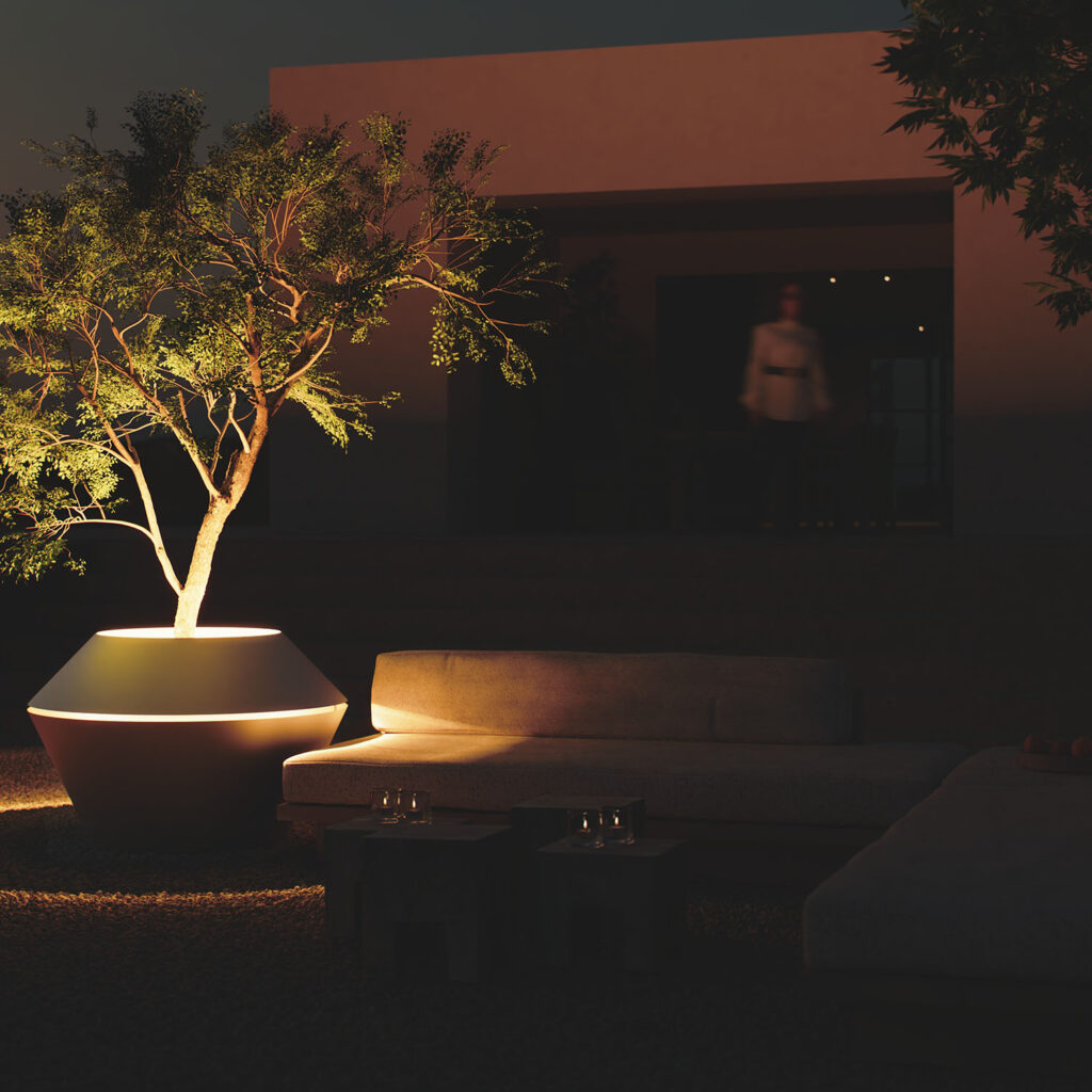 The boundaries between indoors and outdoors continue to blur. We now have outdoor lounge furniture, outdoor kitchens and showers, outdoor rugs, decoration and mood lighting. A dark garden deserves more than merely functional light. Spotlights illuminate trees and shrubs planted both in the soil and in XXL-planters. The next level of stake spotlights are ground spotlights – for in the garden. For the outdoor furniture, spotlights on stakes with cables are, sorry were, the only alternative. But there had to be a better way. A different way of lighting. Mazu came up with the Ambient Planters: both decorative and functional! The lighting is integrated into the upper rim of the planter, without fixtures and cables on the soil. The beam of light shines from the base of the trunk to the top of the tree, the plant ‘gives’ 270 degrees of light. All that remains is that single power cable outside the pot, leading to the power hub.