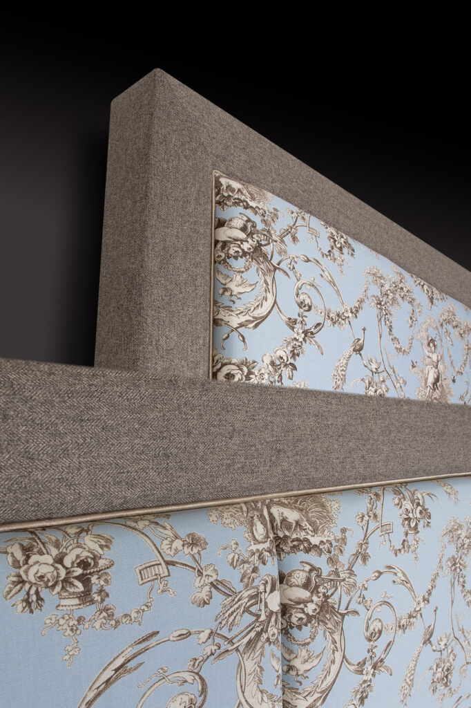 The Boétie and Rêveries headboards bring the cross-pollination between the past and the present into sharp focus: a minimalist framework filled with a classical theme. The exclusive fabric collections have been developed in collaboration with Maison Thévenon: a French family firm (1908), renowned for its exceptional interior fabrics (furniture, curtains). The Ludivine collection is a legendary ‘toile de Jouy’ in traditional light blue and rust brown. Toile de Jouy? This fabric dates back to the 18th century. Back then it was printed with idyllic tableaux of rural life or mythological scenes; now for ‘Le Sommeil Français’ it features classic and floral designs inspired by the cultural patrimony. By contrast, the Pondichéry collection is more exuberant: a decorative fabric in flamboyant colours. This has been designed by Studio Inkfabrik, self-described as the ‘Parisian duo from Berlin’.