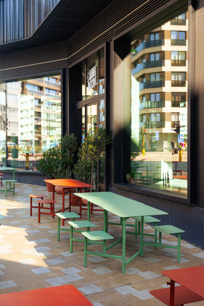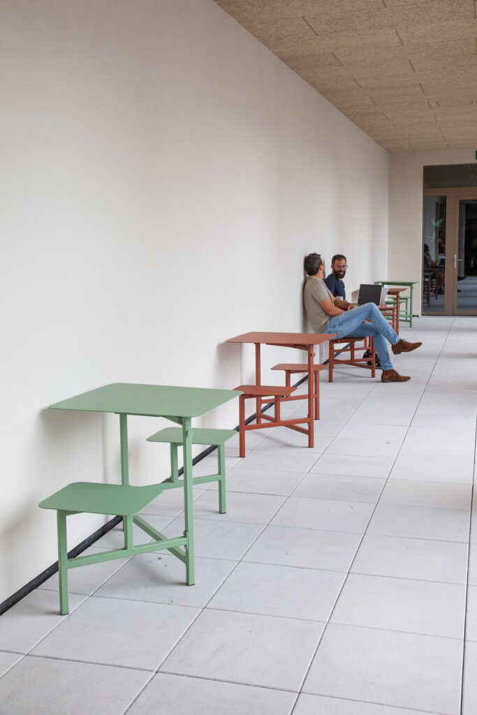 With public spaces in mind, The Duo became a modular concept. You can position sets individually, and slide them together to create a (meters-)long table. You decide what makes most sense at any given moment. Handy additions for hospitality settings include floor anchors and bag buddies, a bag hook beneath the tabletop, affixed to the leg. This keeps bags off the floor, in sight, and to hand. The Duo solves all kinds of issues: guests typically get up and leave chairs pulled out. Sliding them back beneath the table seems to be an issue. Chairs standing around at all angles look so messy, give such a sloppy impression. The Duo always looks neat! Makes cleaning the floor a whole lot quicker: a lifesaver for hospitality settings. For the contract market, you can have a set made in your house style: from the colour up to and including your logo on The Duo and/or the matching cushions.