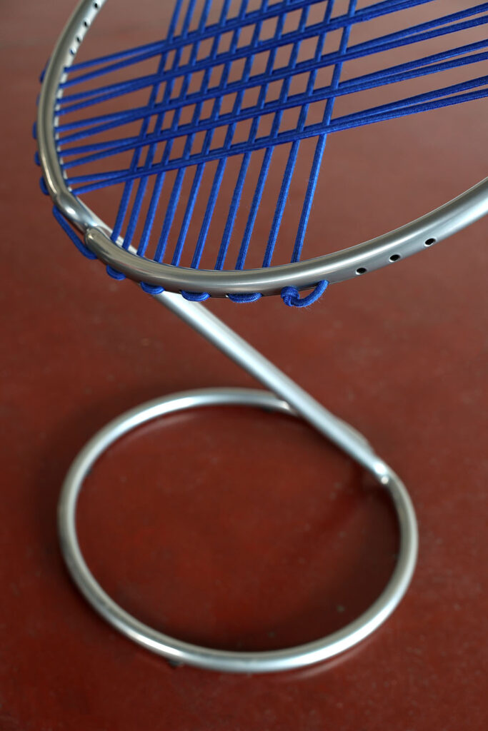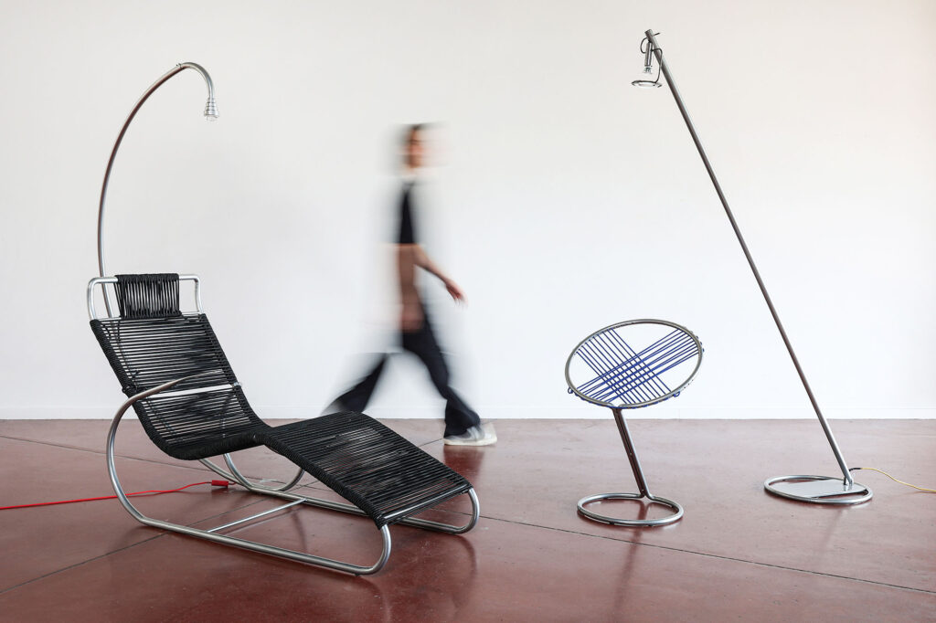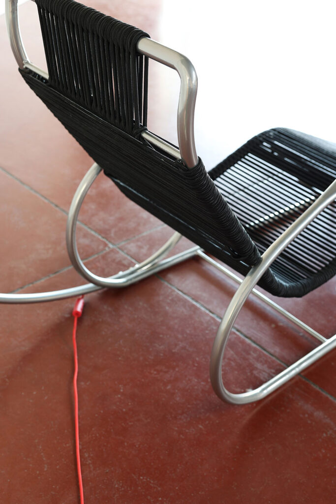The Loop recliner is based on Charlotte Perriand’s research for the LC4, into ergonomic and relaxed reclining positions. The conclusion: elastic bands and a floating tubular frame, that’s it! Your body sinks into the elastic tensioning, you feel embraced, safe, cherished. You sway with the movements of your body, you float above the ground, a hint of letting go, taking a distance from ‘the world’. This is your feel-good moment: rest!