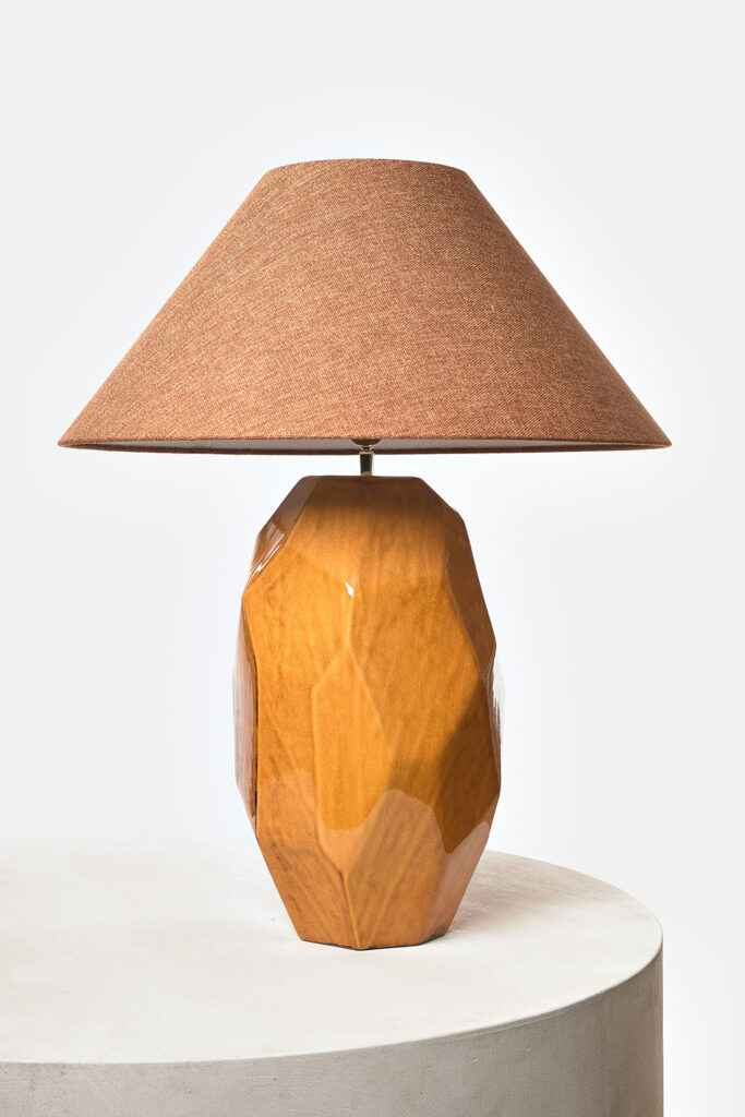 So where is this craving for cosiness and nostalgia at its strongest? The classic table lamp with its fabric lampshade. Marckdael was already supplying these, with the familiar lampshade shapes. This year, the ceramic base is taking on a more decorative, artisanal look. A barrel-shaped model appears faceted, sculpted into the form of a diamond. A column base is adorned with three-dimensional graphic retro patterns.