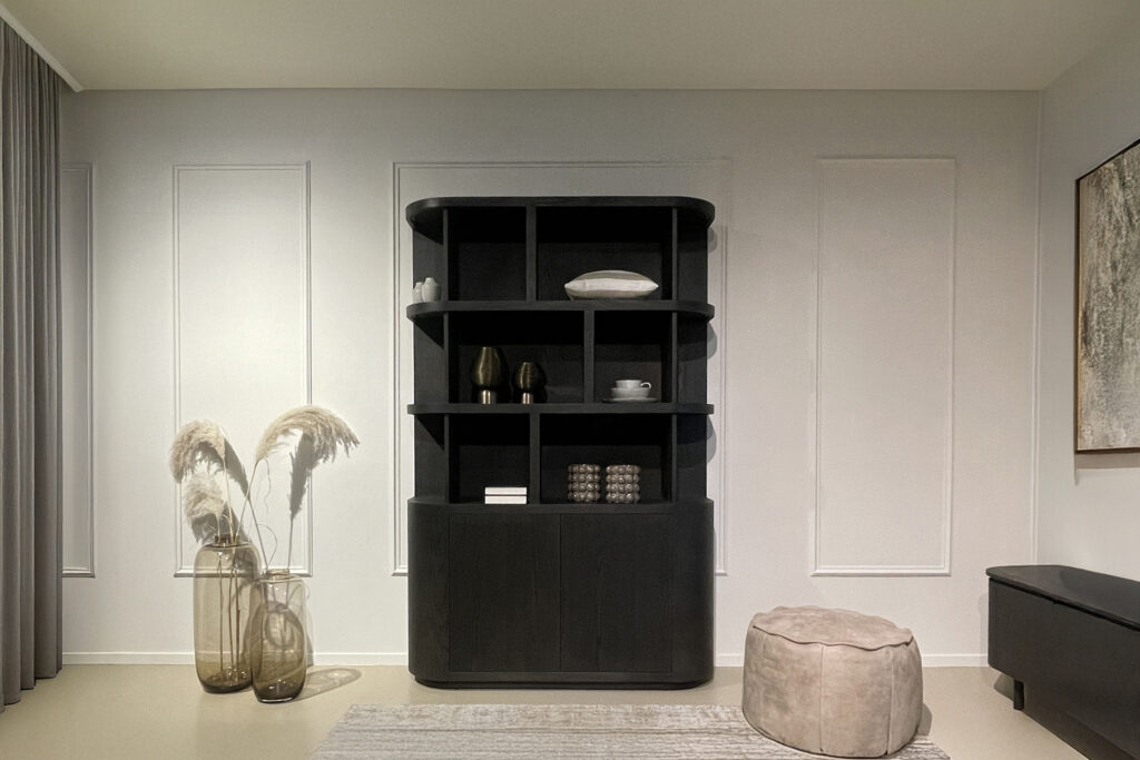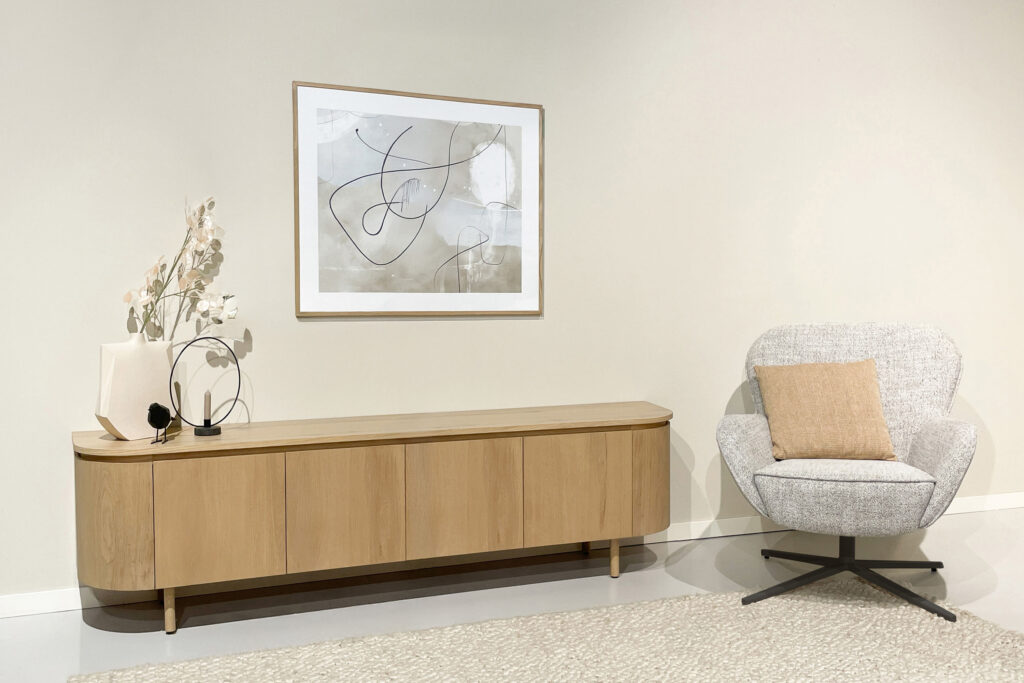 Plinths complete a room. They are conspicuous by their absence. They determine the mood of an interior and the style of the furniture. Low plinths against the wall; high legs beneath the sofa and the cabinets. And vice-versa: high plinths against the wall; closed plinths beneath the sofa and for the cabinets. For both plinth heights, LivingFurn offers a complementary cabinet collection in oak veneer. The minimalist design begins and ends with a rounded side. Novero stands atop a plinth, Tobago on legs. An additional difference is the position of the top: with Novero it fits snugly so is ‘seamless’; with Tobago it is elevated so is ‘floating’. The legs and the top lend Tobago a light and airy character. Here a cumulus cloud also appears: materialised in the cloud-shaped coffee table. Now for the oak news: stylised organic shapes in calm, neutral colours (natural, espresso).