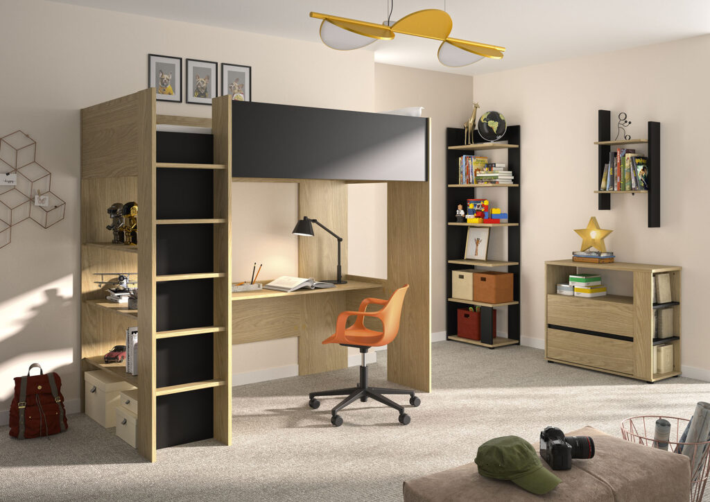 A familiar sight at Gautier is the youth bedroom. Nael is a spin-off of the successful Duplex range. The mezzanine layout is the perfect solution for young adults. The space beneath the bed has been raised to create a fully-fledged workspace — with no need to bend over (high sleeper).