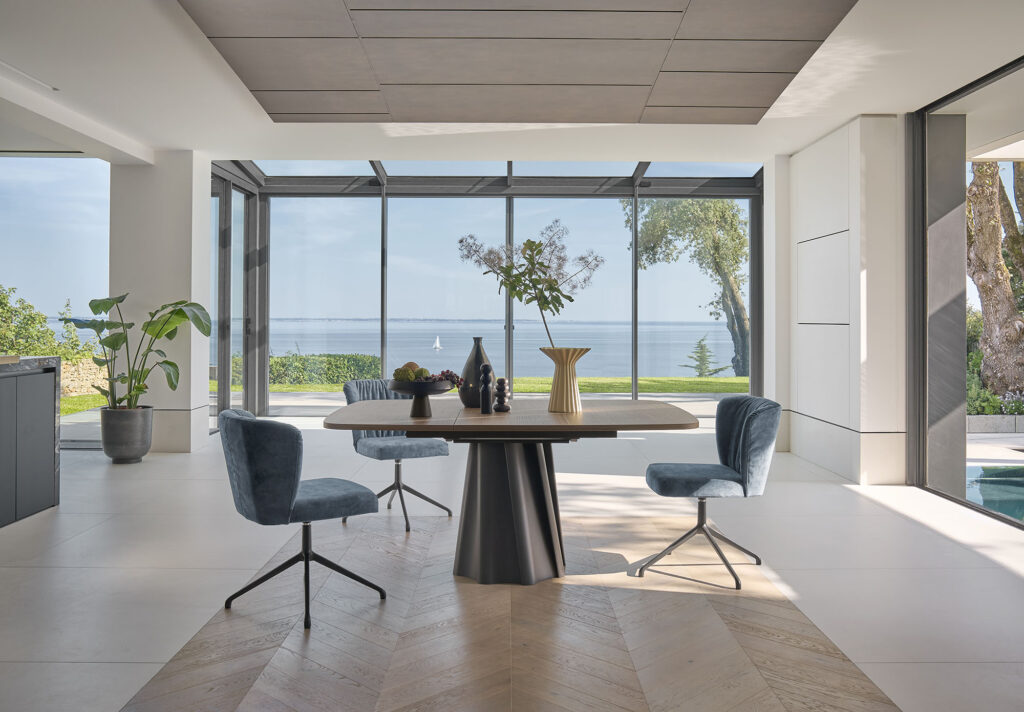 This French flair is immediately apparent in the Twist table. A sleek metal column leg is gently twisted into a wave-like shape, a visually dynamic pattern. With a little imagination, you see the hand at work, carefully turning. The column leg stands tall in flowing folds, like a tablecloth falling over the edge. The tabletop can be synchronously extended from 118 to 166 cm.