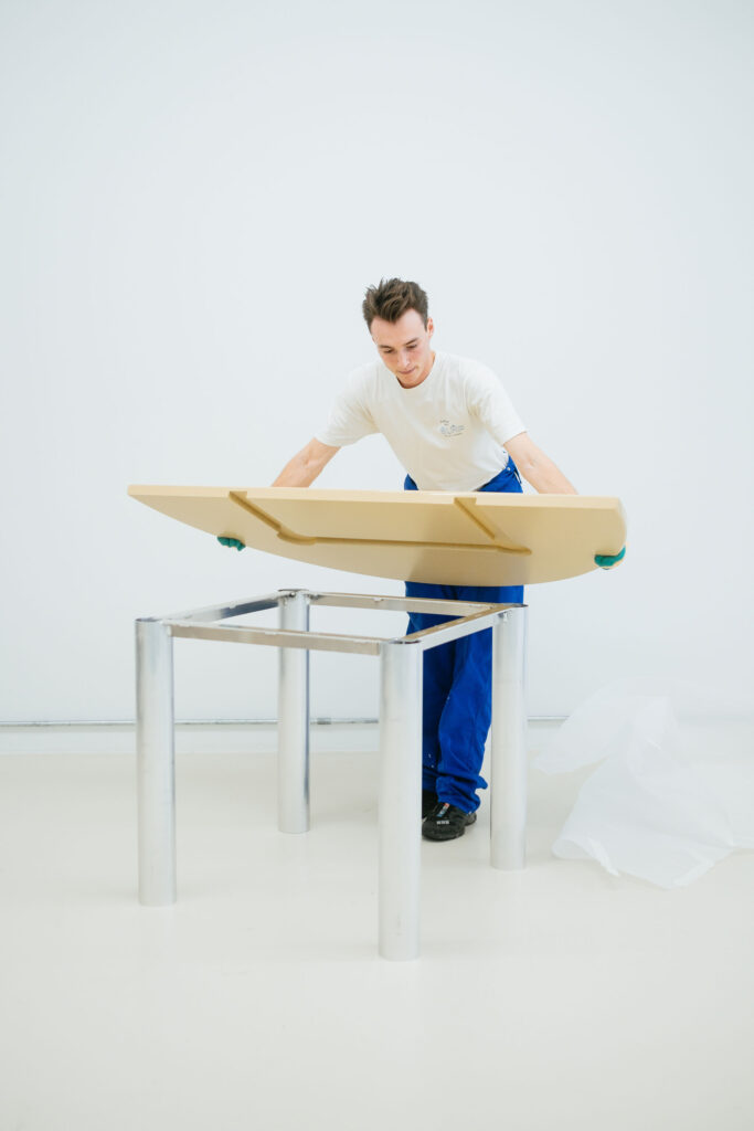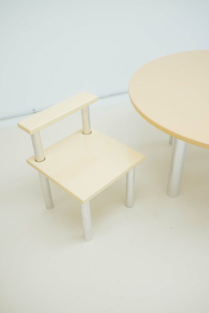 The 808 series reflects a philosophical concept: life can be this simple. The same is true of the design concept: the most elementary form of a table, a chair, a bookcase. Every child draws four legs and a plank. That image is stored in our collective memory. ‘A designer is not a craftsperson! Everything I design I want to be able to make myself. So I keep it simple.’ That’s why the 808 series works with childish simplicity: an aluminium tube (legs) and a wooden plank (tabletop, seat, backrest). The dual balance principle also plays a role here: the harmony of opposites in life, and in nature. The matte, untreated aluminium with its raw texture for the vertical supports. The high-gloss wood for the horizontal, rounded planks. Just imagine: with eight (!) layers of lacquer and polished in between. Result: as mirror-smooth and reflective as premium coated metal. These optically floating planks seem to hang free of the supports. The aluminium tubes run perfectly centred through the cut-out in the planks. An invisible cylinder and distribution plate keep everything in place. The chair’s standout feature is the horizontal backrest: it’s at the same height as the top of the dining table, and serves as an armrest, side table and extension table. A single chair is your personal extension to the table. Several chairs together form a circle. You sit relaxedly on the chair: more or less sideways, nice and casual. Jord is a child of our time.